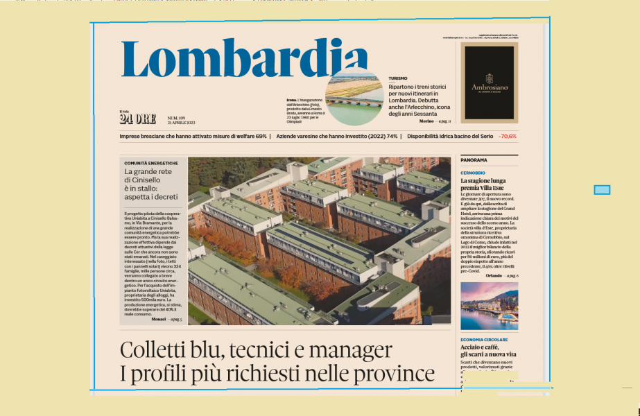 Comunità energetiche. Il progetto pilota della cooperativa Uniabita a Cinisello Balsamo, in Via Bramante, per la realizzazione di una grande comunità energetica potrebbe essere pronto, si legge sul Rapporto Lombardia del Sole 24 Ore. Nei caseggiati interessati vivono 324 famiglie, mille persone circa, che verranno collegate a breve dentro un unico circuito energetico. Per l’acquisto dell’impianto fotovoltaico Uniabita, proprietaria degli alloggi, ha investito 500mila euro. La produzione energetica, si stima, dovrebbe superare del 40% il reale consumo.